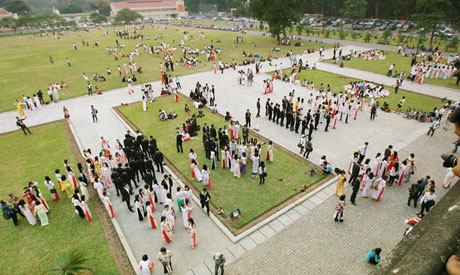 Các bạn sinh viên không thể chụp được một bức ảnh tập thể mà không có người xung quanh.