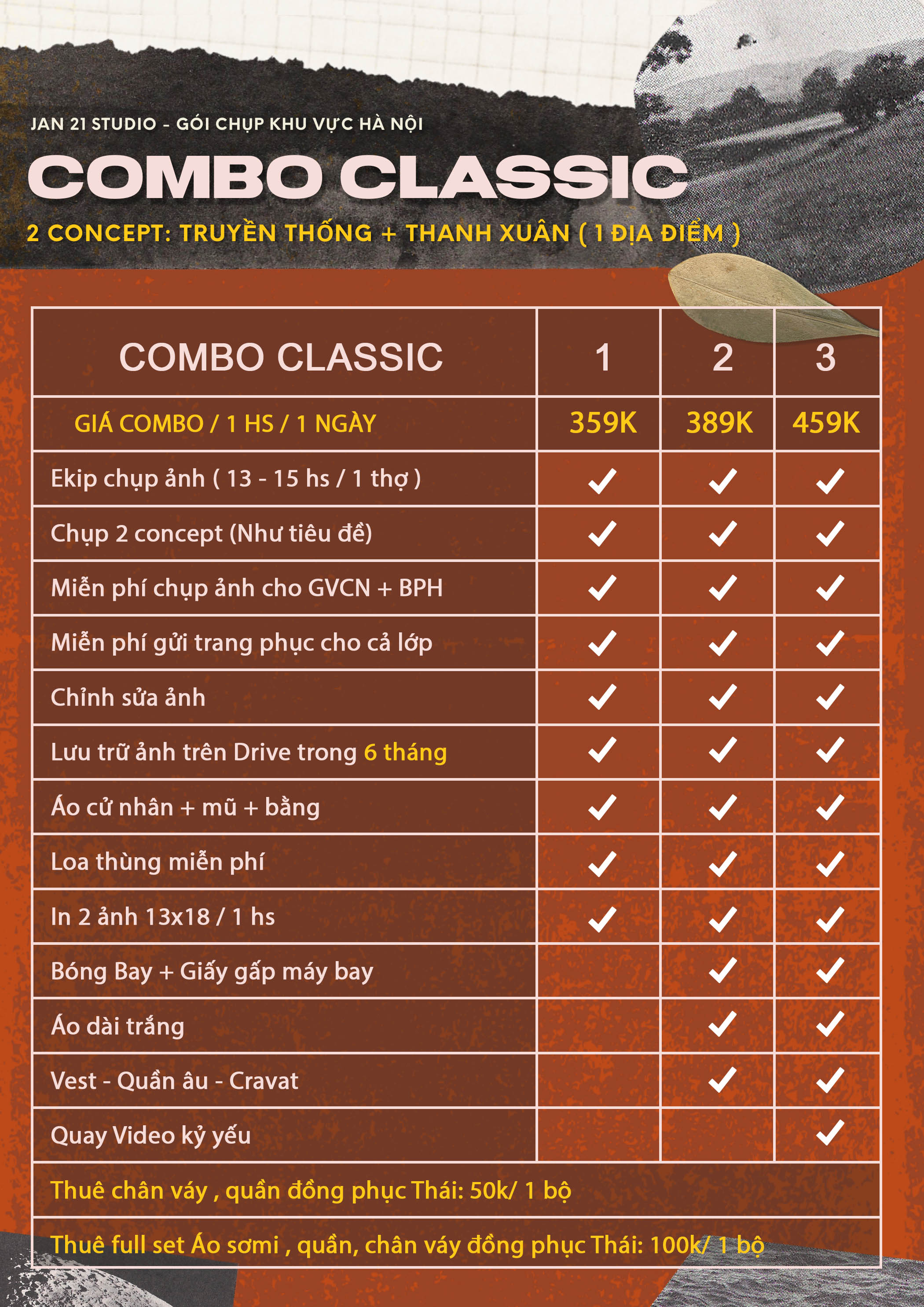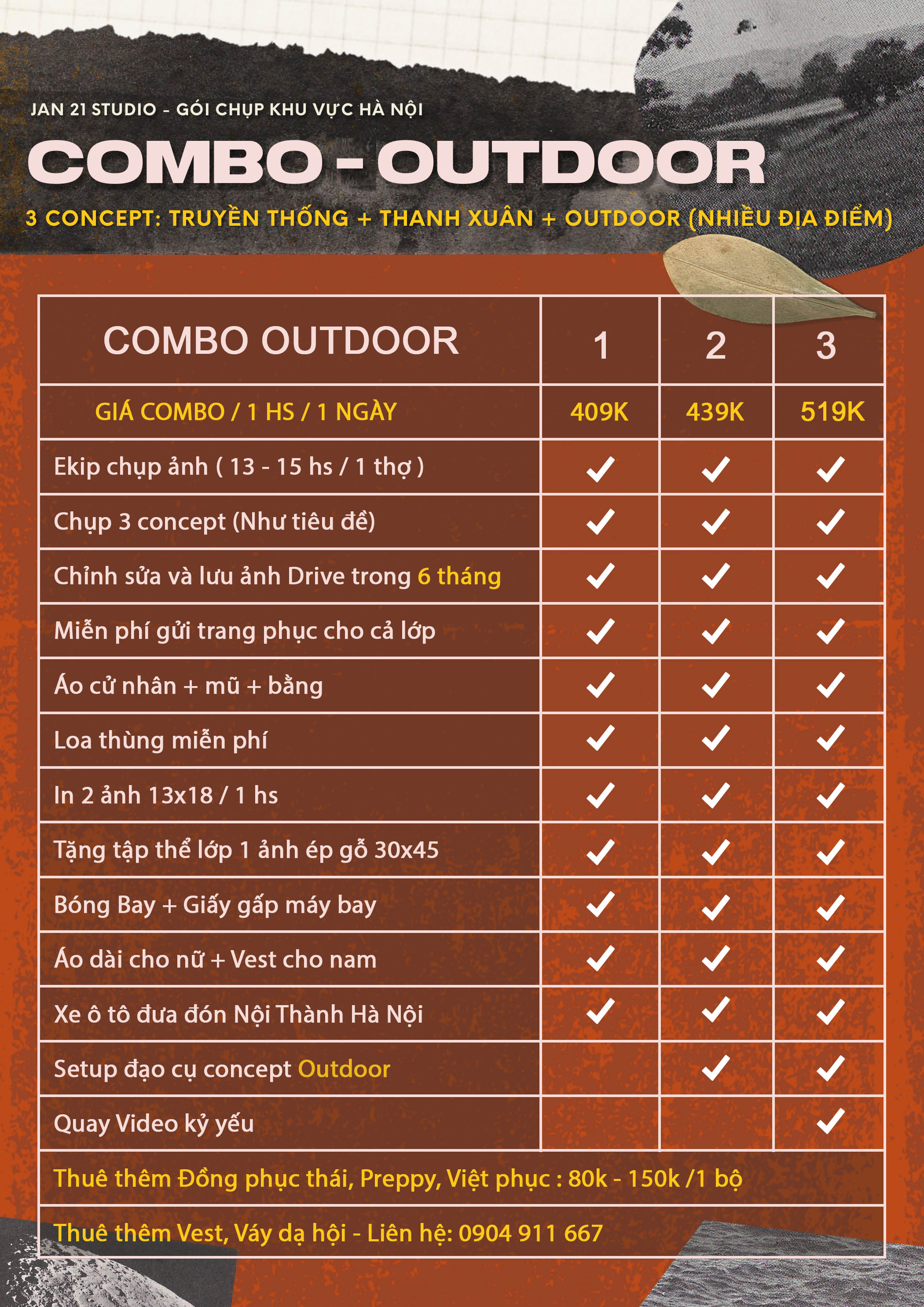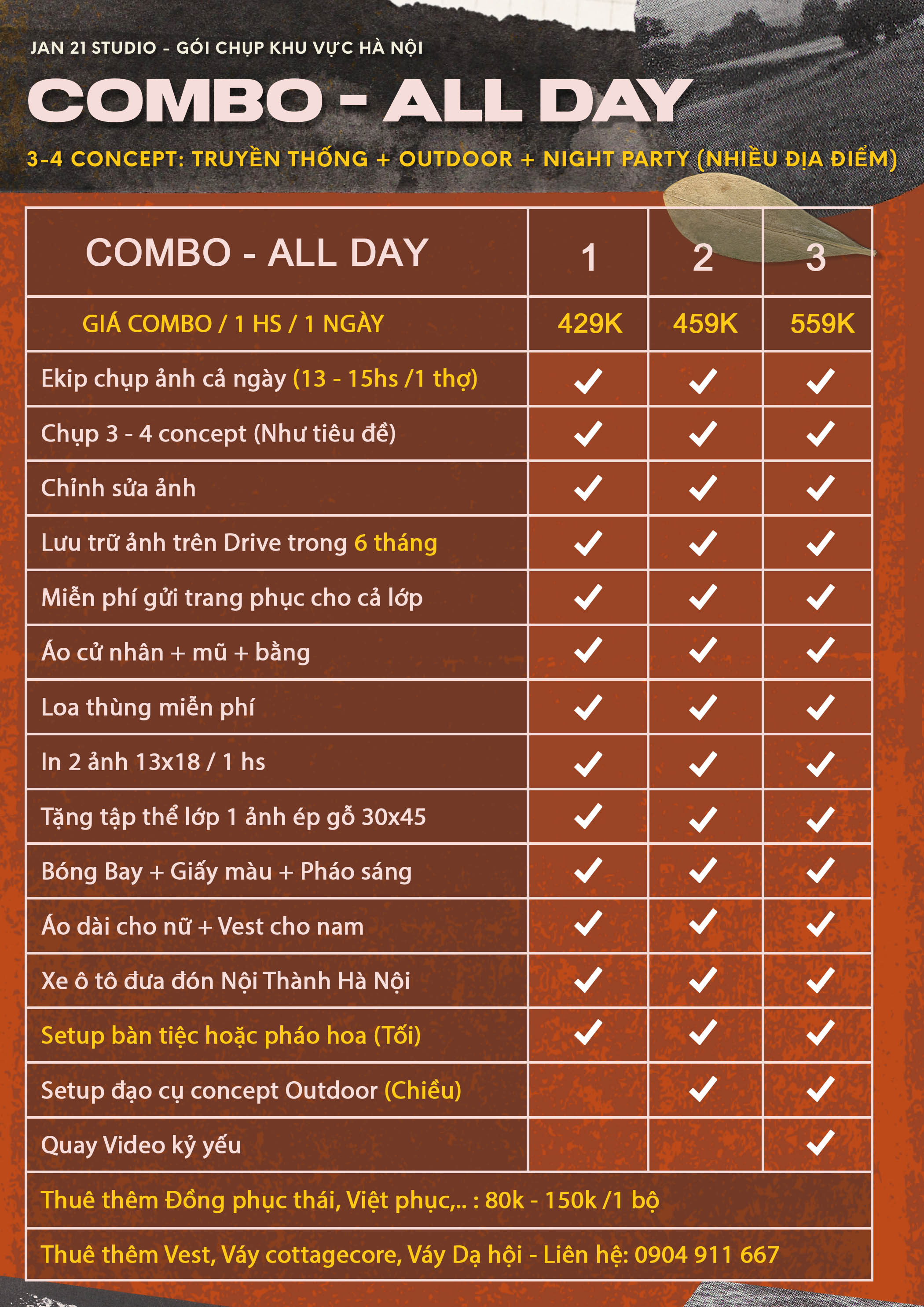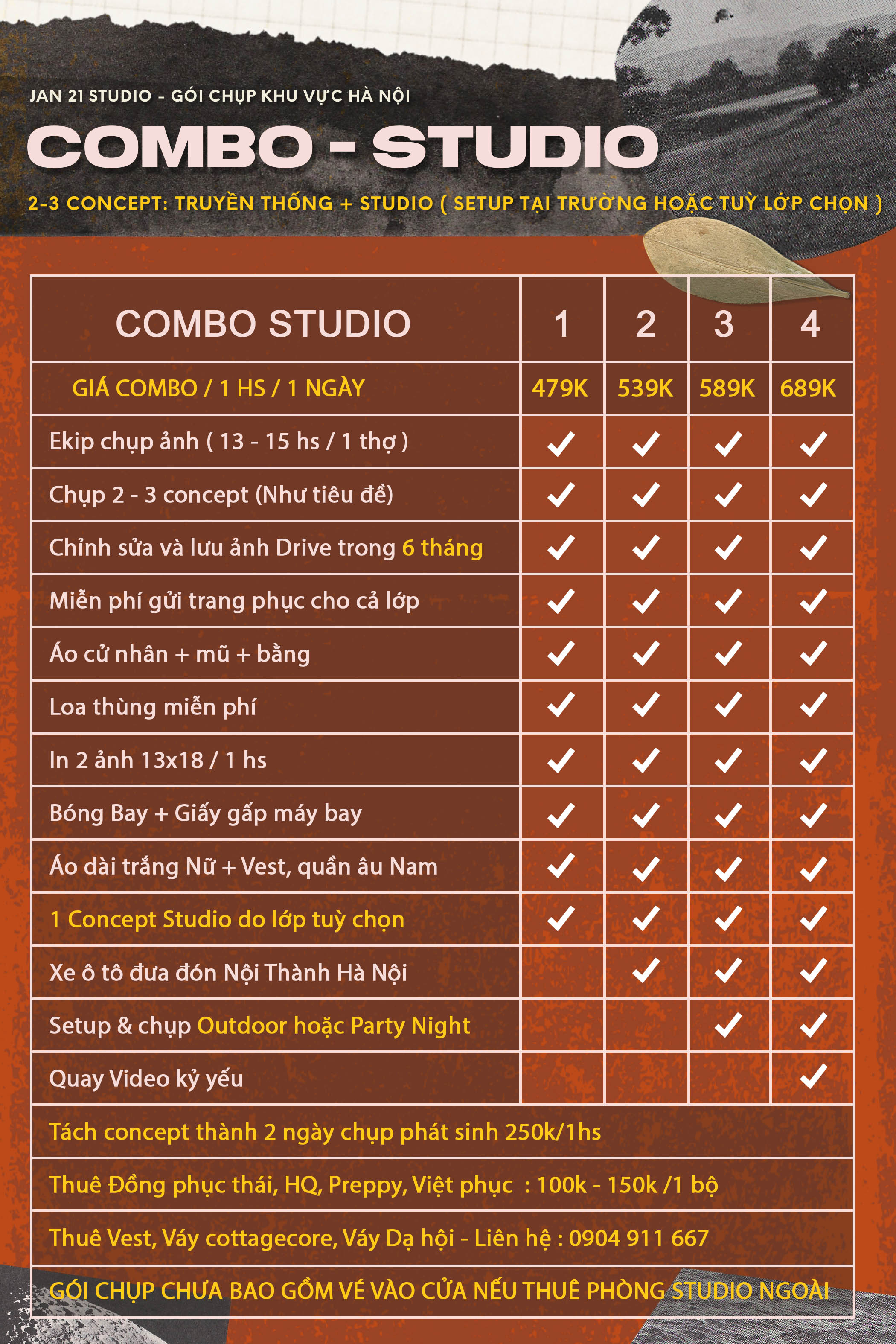 JAN 21ST STUDIO Jan đã có kinh nghiệm 12 năm trong lĩnh vực chụp ảnh kỷ yếu toàn quốc. GIẢM NGAY 5-10% KHI ĐẶT LỊCH CHỤP VÀO CÁC NGÀY TRONG TUẦN TRỪ NGÀY LỄ (Thứ 2-Thứ 6) Áp dụng cho các gói Outdoor, Night Party, Studio (Từ 450k trở lên) (BÁO GIÁ DÀNH CHO LỚP TRÊN 30 NGƯỜI) BÁO GIÁ: ÁP DỤNG TỪ NGÀY 01/11/25 2 CONCEPT : TRUYỀN THỐNG +...