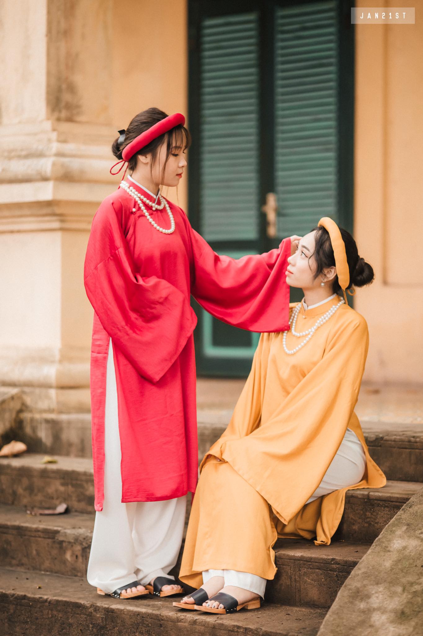 Còn gì tuyệt vời hơn khi mặc tà áo dài, trang phục cử nhân và Việt phục ghi lại một tấm hình bên mái ngói đỏ cong cong, hàng gạch đỏ, những bức tường rêu phong, cột sơn son thiếp bạc và những cụ rùa đá nghìn tuổi,… hoài niệm về cung đình xa xưa.